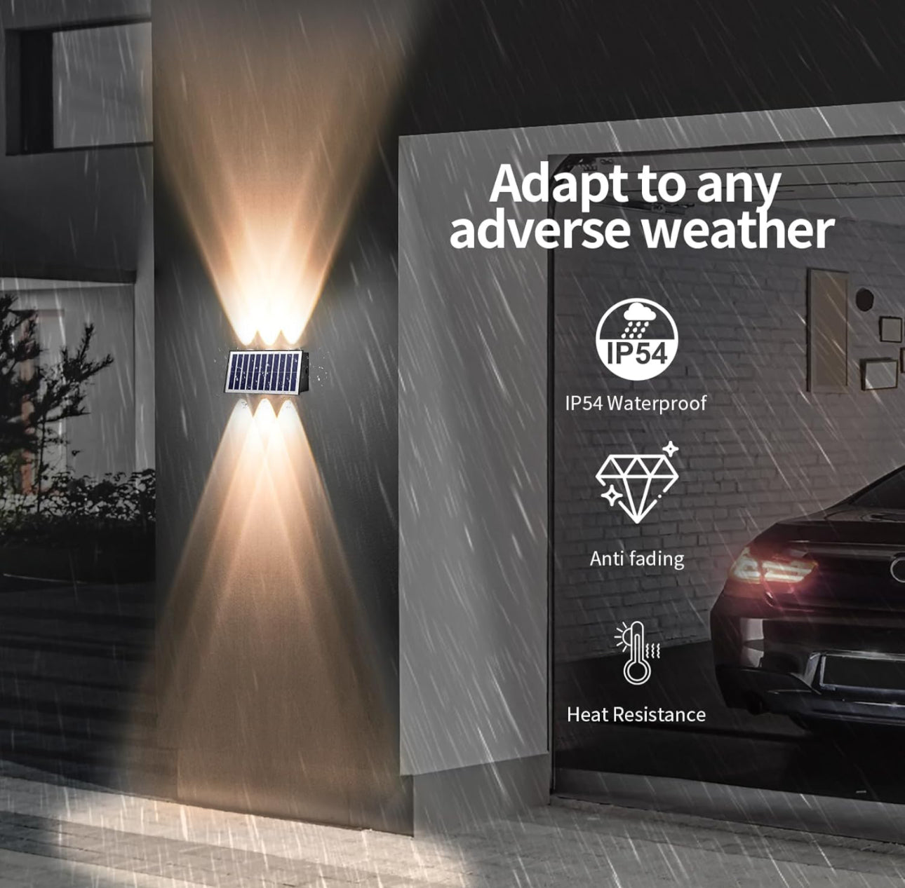 • ☀【Up And Down Solar LED Wall Light & Automatic Work】Outdoor solar wall light has three beams of light above and below. This design enhances the lamp’s brightness and is aesthetically pleasing.The solar powered outdoor lights can automatically charge during the day and automatically light your home at night.