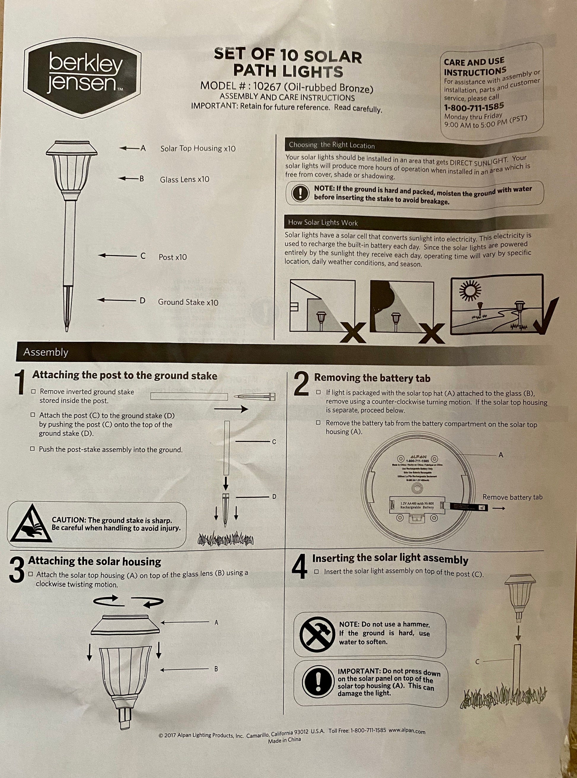 15 lumen highly efficient solar lightsMade from durable die-cast aluminum and stainless steelTimeless oil-rubbed bronze finishClear glass lensWarm white ledEfficient crystalline solar panel captures maximum energyUses one rechargeable battery per light (included)Includes ten solar top hats, ten glass lenses, eight posts, ten ground stakes, ten Ni-Mh rechargeable batteries, and instruction manual