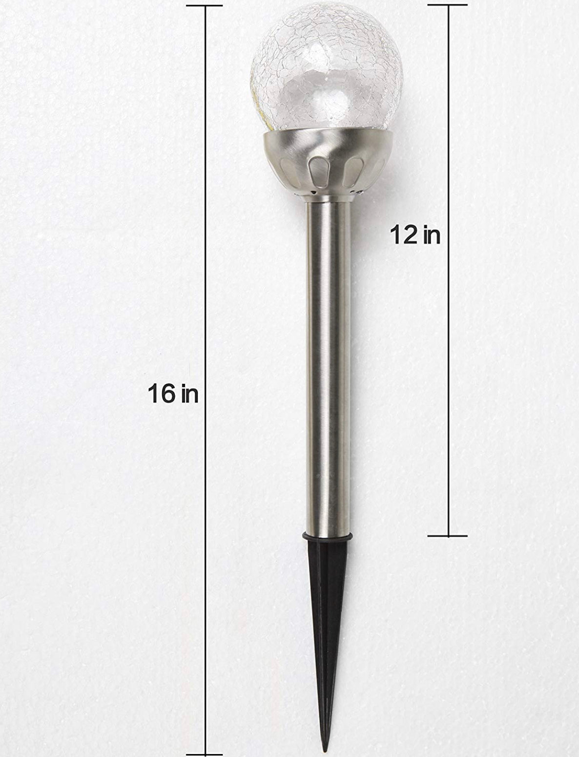 You are bidding on 8 brand new Premium Quality Solar Crackle Glass Ball Stake Lights in their original retail packaging. These lights illuminate perfect amount of ambient light for your quiet romantic evening outdoor. It will be a great conversation piece for your outdoor gatherings. These energy-efficient, low-maintenance solar lights add a charming, decorative glow to your driveway, patio or flowerbeds.