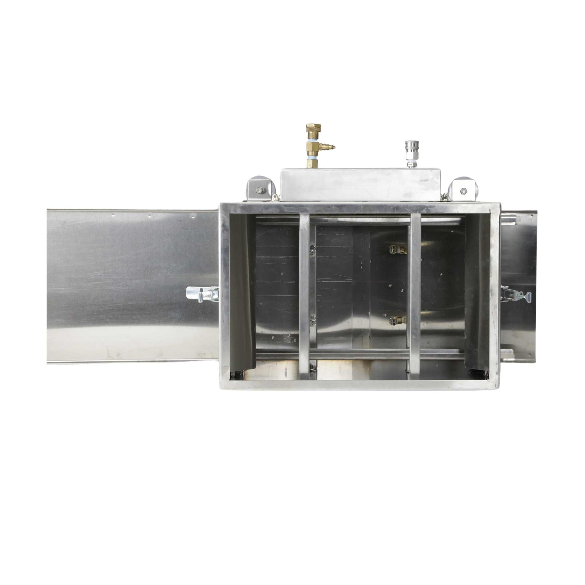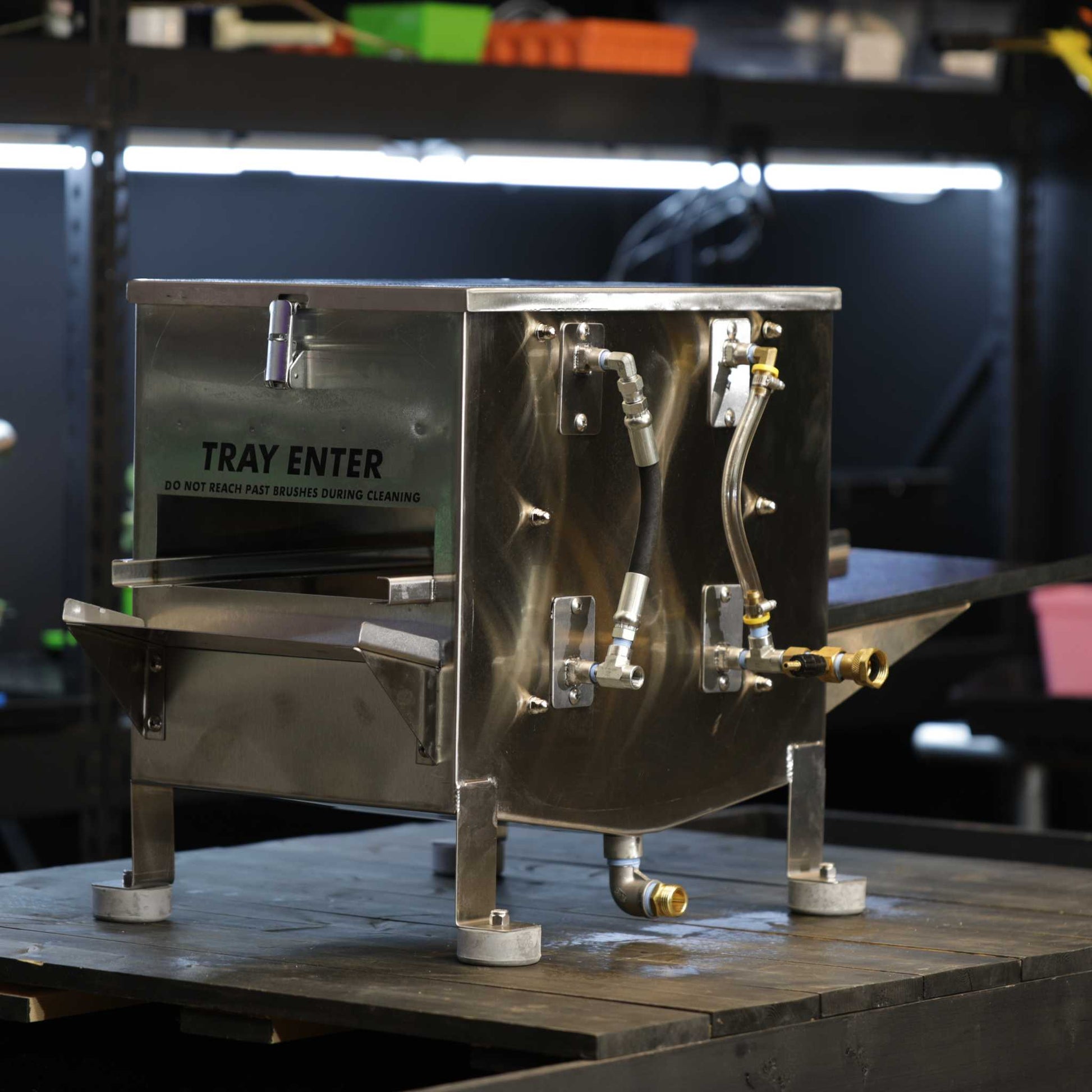 Bootstrap Farmer’s Texas-fabricated, stainless steel tray washer speeds up tray washing with four powerful high-pressure fan nozzles and a low-pressure sanitizing rinse. The tray washer requires a pressure washer (purchased separately) to function. See pressure washer recommendations below.