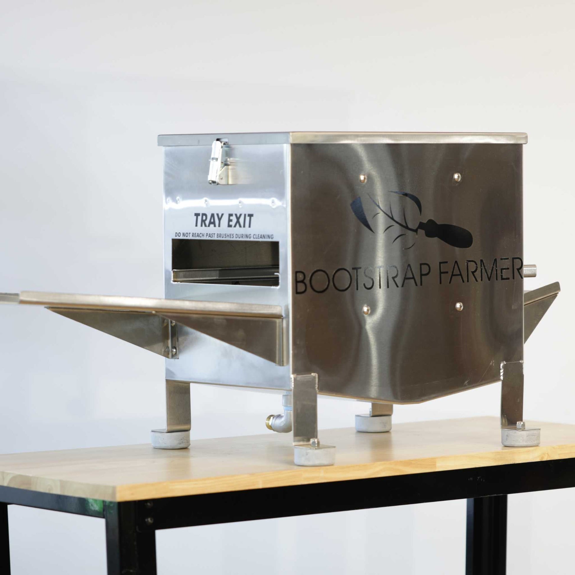 Please note that our washer is solely designed for the industry's strongest trays. We cannot guarantee against damage to non-Bootstrap Farmer trays.