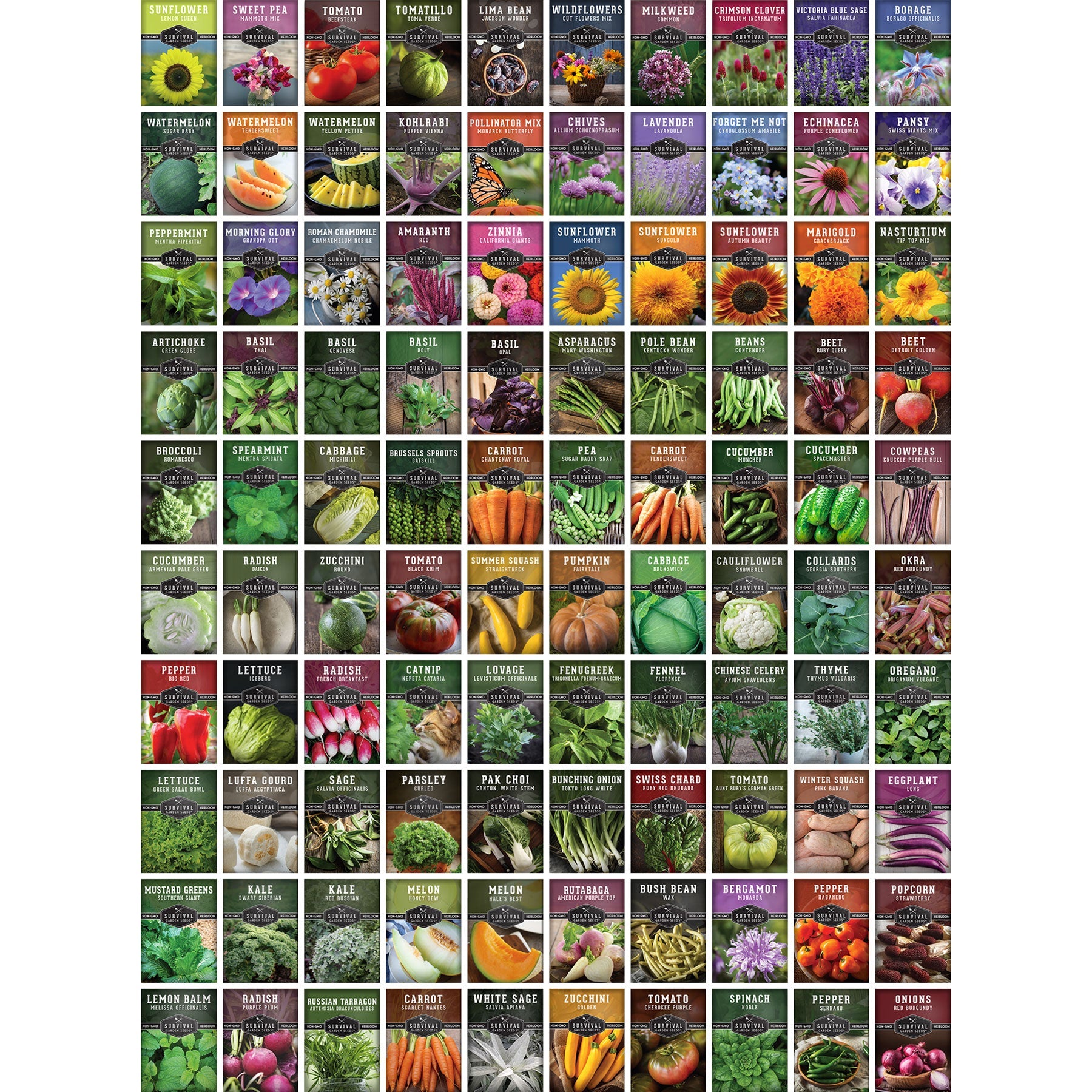 Red Amaranth, Green Globe Artichoke, Mary Washington Asparagus, Genovese Basil, Opal Basil, Thai Basil, Contender Bean, Henderson Lima Bean, Jackson Wonder Lima Bean, Kentucky Wonder Pole Bean, Wax Bush Bean, Ruby Queen (Red) Beet, Detroit Golden Beet, Blue Sage (Salvia farinacea), Borage, Romanesco Broccoli, Catskill Brussels Sprouts, Michihili (Napa) Cabbage, Brunswick Cabbage, Chantenay Royal Carrot, Scarlet Nantes Carrot, Tendersweet Carrot, Snowball Cauliflower, Roman Chamomile, Chinese Celery, Common Chives, Crimson Clover, Georgia Southern Collards, Knuckle Purplehull Cowpeas, Armenian Cucumber, Muncher Cucumber, Spacemaster Cucumber, Long Eggplant, Fennel, Fenugreek, Forget Me Not, Four O'Clock Flower Mix, Luffa Gourd, Dwarf Siberian Improved Kale, Red Russian Kale, Purple Vienna Kohlrabi, Green Salad Bowl Lettuce, Iceberg Lettuce, Marjoram, Hales Best Melon, Honey Dew Melon, Common Milkweed, Grandpa Ott Morning Glory, Southern Giant Mustard Greens, Tip Top Nasturtium, Red Burgundy Okra, Tokyo Long White Onion, Red Burgundy Onion, Oregano, Canton White Stem Pak Choi, Swiss Giants Pansy Mix, Curled Parsley, Sugar Daddy Snap Peas, Big Red Pepper, Habanero Orange Pepper, Marconi Red Pepper, Serrano Pepper, Monarch Butterfly Pollinator Mix, Parsnip, Fairy Tale Pumpkin, Daikon Radish, French Breakfast Radish, Purple Plum Radish, American Purple Rutabaga, Common Sage, Blue Sage, Sorrel, Spearmint, Noble Giant Spinach, Acorn Squash, Pink Banana Winter Squash, Straight Neck Summer Squash, Autumn Beauty Sunflower, Lemon Queen Sunflower, Dwarf Sungold Sunflower, Mammoth Sunflower, Mammoth Mix Sweet Pea, Ruby Red Rhubarb Swiss Chard, Russian Tarragon, Thyme, Toma Verde Tomatillo, Ace 55-VF, Aunt Ruby’s German Green Tomato, Beefsteak Tomato, Black Krim Tomato, Cherokee Purple Tomato, San Marzano Tomato, Watercress, Georgia Rattlesnake Watermelon, Tendersweet Orange Watermelon, Yellow Petite Watermelon, Wildflowers Cut Flower Mix, California Giants Zinnia, Golden Zucchini, Round Zucchini