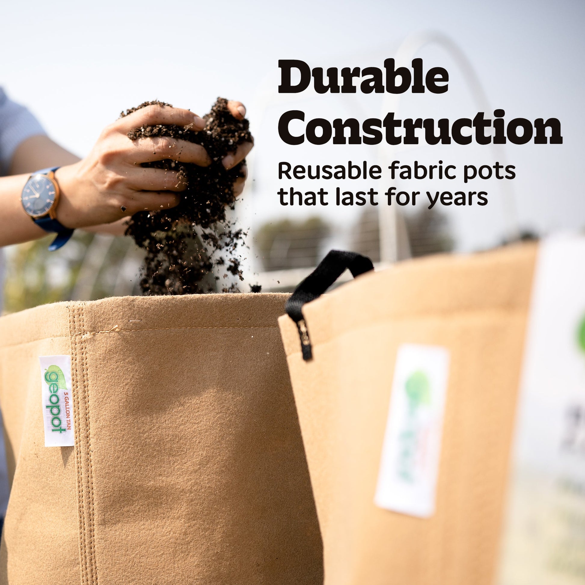 Perfect for container gardening, raised bed alternatives, and large-scale cultivation, GeoPot Tan Grow Bags with Handles offer heat protection, better aeration, and stronger plants with less effort.