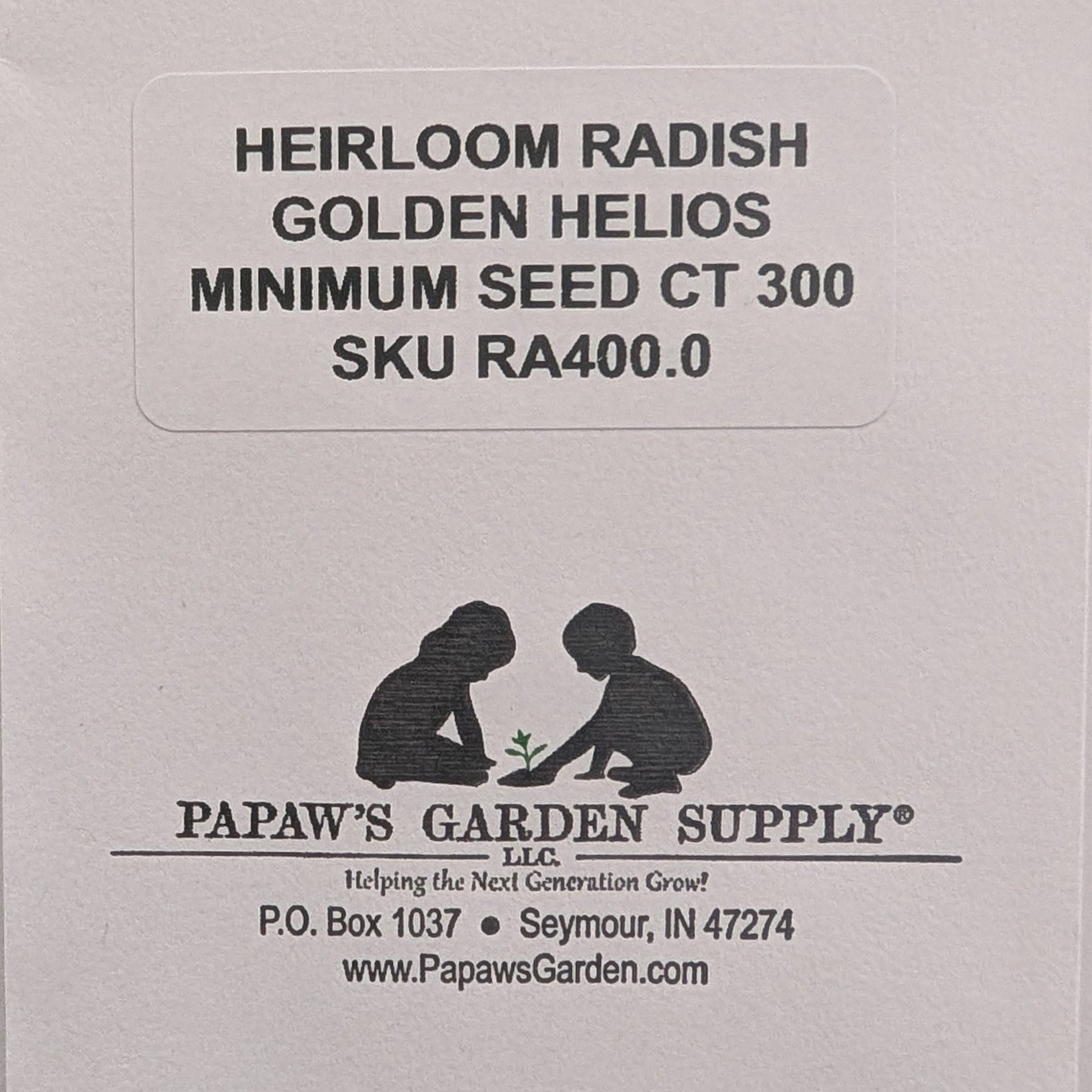 Golden Helios Radish variety is known for its Yellow skin!  This fine Czechoslovakian heirloom radish makes for great fresh eating all season. Its round, smooth, bright yellow ¾" roots with tangy, white flesh are perfect for fresh eating, salads, and veggie platters. Sow radish seeds in well-worked soil after danger of frost in early spring, again in late summer for a fall crop. In frost-free areas, sow in the fall.