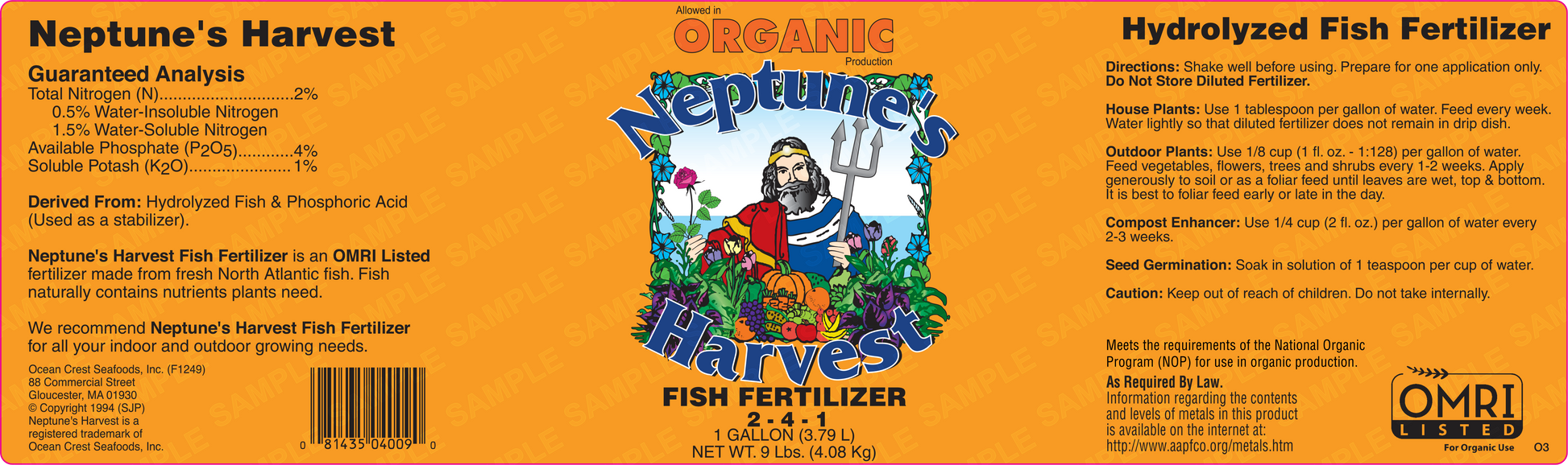 Neptune's Harvest Hydrolyzed Fish is an organic fertilizer made from fresh North Atlantic fish. It is made by a unique cold process that protects the vitamins, amino acids, enzymes and growth hormones. It also contains all the micro and macro nutrients naturally found in fish. The nitrogen and other nutrients are chelated, so they are readily available for plants consumption. Unlike fish emulsions, Neptune's Harvest's Fish Hydrolysate retains the natural fish proteins and oils and has no unpleasant odor. University studies have shown Neptune's Harvest to outperform 20-20-20 chemical fertilizers. OMRI certified.