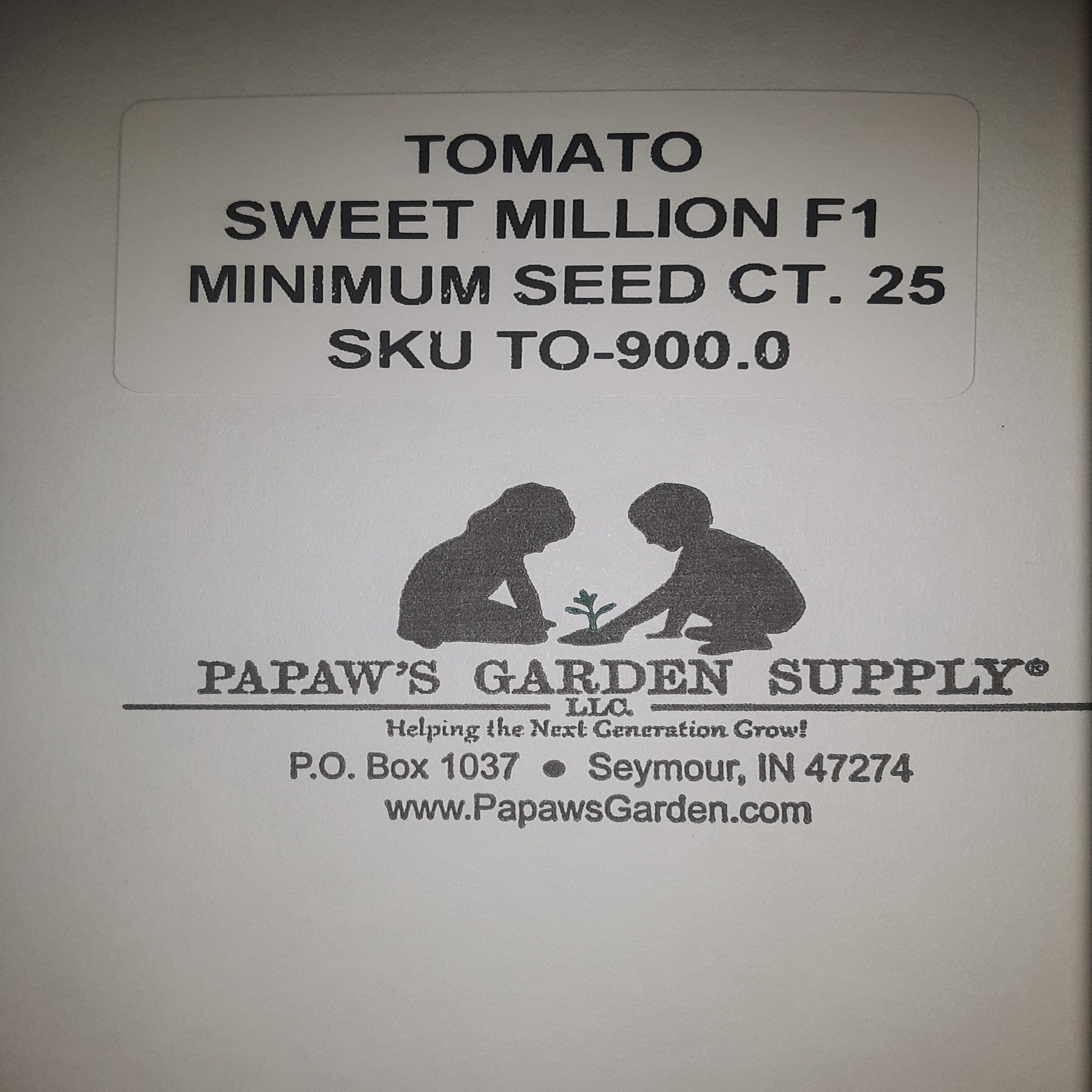 Sweet Million Cherry Tomato Seeds produce grape-shaped flavorful mini tomatoes. This tomato breed is a red cherry tomato variety known for its prolific plants and very sweet taste. This modern hybrid variety produces long trusses of dark red cherry tomatoes with a smooth, crack-resistant peel. Each cherry tomato is about 1” to 1 ½” wide, making it perfect for fresh salads and summer recipes. Indeterminate growth habits.